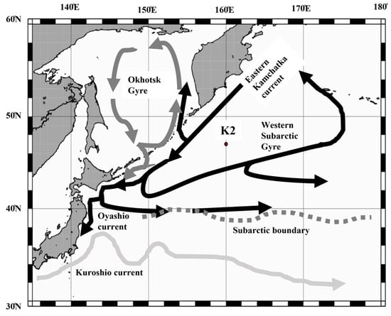 Location of sampling station K2 (47° N, 160° E) in the western subarctic Pacific. The approximate positions of the currents are superimposed [32].