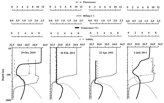 Vertical distributions of temperature, salinity, dissolved oxygen, and fluorescence at each sampling date are shown in Figure 3. Throughout the season, the temperature was at 0.7–8.5 °C, salinity for 32.5–34.5, DO ranged between 0.6 and 10.4 mg L−1, and fluorescence was 0.02–2.32. Seasonal thermocline developed around 50 m in July and October, and temperatures were almost constant for 100 m in February and April. For all seasons, temperature showed a minimum of 1–2 °C approximately at 100 m, then had a maximum of about 3.5 °C around 200 m, and finally decreased with increasing depth. Salinity increased with depth for all seasons. Salinity was similar for depths below 100 m in February and April, while was below 33 at <50 m, forming surface halocline in July and October. DO decreased with increasing depth and was extremely low, less than 2 mg L−1 below 200 m depth. Fluorescence was high at the surface layer above the thermocline (<50 m) in July and October and at 0–100 m in February and April.