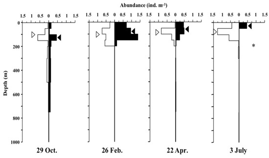 Concerning the vertical distribution composition of each BH of A. digitale, the distribution below 300 m was seen in October for all BH sizes, indicating that the extension of vertical distribution down to the deeper layer was a typical feature of all BH ranges (Figure 5). In February, the modal BH individuals at 8–16 mm BH were distributed near the surface both day and night, while other smaller and larger individuals were distributed at deeper layers. In April, small individuals with BH < 6 mm were distributed below 300 m, while most the individuals with a BH > 12 mm were distributed below 100 m. In July, individuals with BH smaller than 6 mm were distributed at >200 m, but at night, the main individuals with BH between 8 and 16 mm were concentrated for the surface layer at 0–50 m.