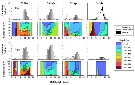 BH of A. digitale was expressed by histograms based on the integrated abundance (ind. m−2) at 0–1000 m water column for the day and night of each sampling date. The depth composition of each BH interval (1 mm) was also calculated.