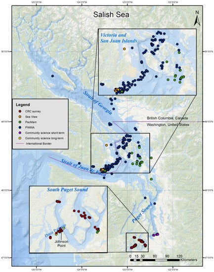 CRC vessel surveys were conducted under NOAA-NMFS permit #20605. We would like to thank all the owners of the whale watch companies for supporting this effort, and all the captains and naturalists for submitting harbor porpoise reports. Our thanks also go out to all the community scientists who have submitted reports, with special thanks to Pam and Charlie Rhubart, Michelle Roy and Kim Merriman, who have monitored marine mammal activity from their homes overlooking South Puget Sound waters for several years. Gratitude is also extended to the Canadian Department of National Defence for supporting data sharing for this study.