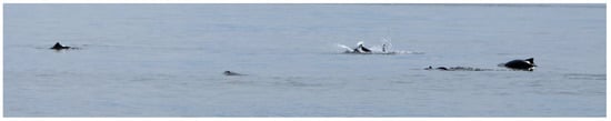 Across all these data collection platforms, behaviors recorded during these encounters could include synchronized group foraging, traveling, mating (which often occurs with males breaching as they attempt to mate—this is a consistent behavior seen in harbor porpoise populations world-wide) (Figure 3) [51], surface chases (Figure 4), spyhops, non-mating breaches, porpoising, fusion–fission of groups, and logging. Due to inconsistent recording between platforms, non-mating social behaviors were grouped into “Social behavior/splashing” (Table 3) (Figure 5). Sub-groups often experience fusion/fission during foraging, coming together for a series of dives, before splitting up again, not always in the same groups. Wake riding was also observed in several cases, with one short-duration bow ride recorded in Dana Passage. Porpoises will often approach slow-moving or stopped vessels during these aggregations. In the short- and long-term aggregations of 100+ individuals, mating attempts can be common, sometimes numbering in the dozens over a relatively short direct observation period (1–2 h). One aggregation had over 40 mating attempts, recorded by an experienced observer with PacMam.