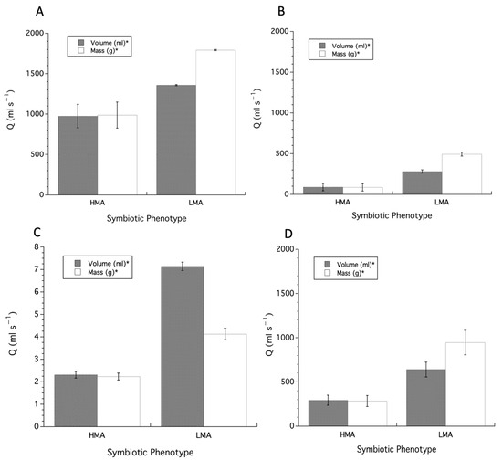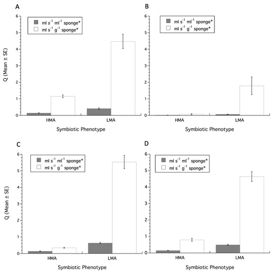 Ratio analysis of sponge pumping (i.e., Q values). (A) Data from Weisz et al. [17], (B) data from McMurray et al. [19] and Gantt et al. [22], (C) data from Morganti et al. [24], (D) data pooled from all sources. HMA = High Microbial Abundance, LMA = Low Microbial Abundance. Asterisks in legend indicate significant (p < 0.05) differences for Q values for volume or mass based on two-tailed t-test.