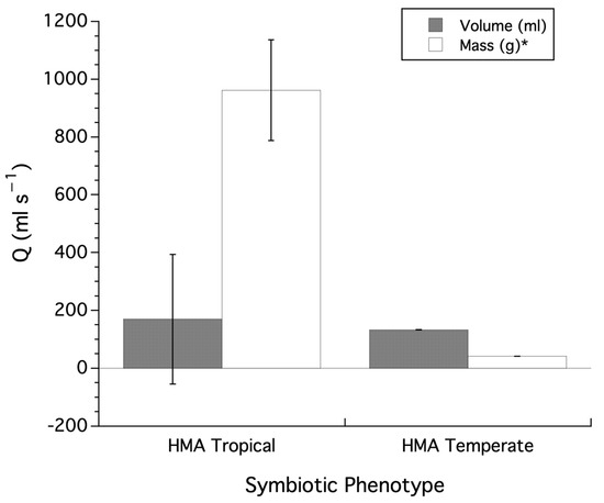 Comparison of adjusted Q values between HMA sponges from tropical and temperate locations. HMA = High Microbial Abundance. Asterisks in legend indicate significant (p < 0.05) differences for Q values for volume or mass based on two-tailed t-test and presented as mean ± SEM.
