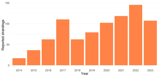 Although an actual increase in strandings may have contributed to an increase in reports over time, stranding reports are furthermore influenced by the reporting effort [47] and may have increased as a consequence of raised awareness. In 2021, a new health and disease surveillance program was officially launched, resulting in increased outreach efforts to raise awareness of the need for reporting strandings. This also coincided with the COVID-19 pandemic when people generally spent more time outdoors. Double reports of the same stranded animal have occurred more frequently since the start of 2021, supporting an increased awareness and effort from this time point, and this reinforces the reliability of the data from 2021 onwards. However, double reports were difficult to identify prior to 2020 because digital tools to easily identify double reports were not yet available. This makes it difficult to assess whether double reports actually have increased or whether new tools have facilitated distinguishing double reports. Despite this, the distinct jump in double reports since 2021 and the new digital infrastructure suggest that the effort should be comparable from 2021 and onwards. Under that assumption, strandings appear to be fairly consistent between 2021 and 2023. Whether or not shifting currents or weather conditions have affected strandings over time was beyond the scope of this study and requires further investigation.