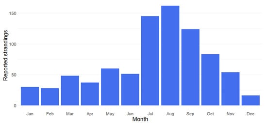 Annually, strandings clearly peak in the months of July, August, and September, then gradually decrease to a minimum in December (Figure 2). Summer stranding peaks align with previous studies, both from neighbouring countries, and studies outside of Northern Europe. In German waters, peak strandings were recorded from June to August in the North Sea while they were delayed until July to September in the Baltic Sea [22]. Along the north-eastern coast of the North Sea and in Danish waters, multiple studies consistently also confirm the strong seasonality of strandings in summer [48,49,50]. Looking outside of Europe, strandings have also been found to peak within July to August in the Sea of Azov [51].