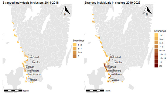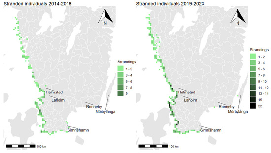 Data sets for spatial analyses included reports of skeletal remains and contained 829 stranding reports with 854 individuals. Strandings were observed in 187 grids in total (N = 125 in 2014–2018 and N = 156 in 2019–2023), covering essentially the whole Swedish west and south coast. However, almost no strandings were reported on the East Coast, with the exception of a few strandings in the Simrishamn municipality between 2014 and 2018 and single findings in the Ronneby municipality and the western coast of Öland in the Mörbylånga municipality between 2019 and 2023 (Figure 3). Although generally increasing, strandings appear to be reasonably consistent spatially, with the highest stranding numbers occuring in southern Halland along the coastlines of Halmstad and Laholm, and in Scania along Öresund.