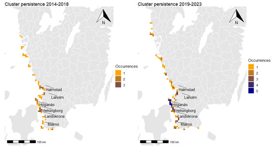 Generally, the cluster distribution is similar for both 2014–2018 and 2019–2023, with the cluster appearance being denser in Öresund and southern Halland and gradually becoming more scarce further north, south, and east of these areas. In 2014–2018, no clusters appeared in more than three out of the five years. More persistent clusters (i.e., clusters appearing two to three times) appear around Öresund, especially the northern part along the coastline of the Höganäs municipality known as the Kullen peninsula, but also along the coastlines of the municipalities of Helsingborg, Landskrona, and the coastlines of the municipalities of Halmstad and Laholm in Halland. Clusters occurred more frequently in 2019–2023, with some clusters occurring all five years. Similar to the previous five years, the most persistent clusters are situated along the coasts of Höganäs, the Kullen peninsula, Helsingborg, and Landskrona, but even more distinctly than previously. Distinct clusters in Halmstad and Laholm also persist. Notably, the largest difference between the two periods is the appearance of persistent clusters along all of Lommabukten, north of Malmö.