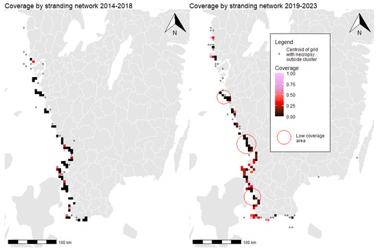 Median coverage increased between the two periods of 2014–2018 (Mdn = 0, = 0.0679) and 2019–2023 (Mdn = 0.0839, = 0.175) (p < 0.001). During both periods, several individuals located outside of grids identified as clusters were retrieved for necropsy. This includes areas, for both periods, far north on the West Coast and, for the later period, on the South Coast, as well as individuals east of Scania. Most areas in 2014–2018 had nearly zero coverage. Coverage increased in general during 2019–2023 and there were fewer areas with zero coverage. However, some distinct regions with nearly zero coverage remain. These are highlighted with red circles in Figure 6. These regions include the coast of Falkenberg, northern Halmstad, southern Gothenburg, and areas around Lommabukten. While efforts are made to enter all reports of known strandings into the database, two of the grid cells for 2019–2023 had more individuals retrieved for necropsies than there were stranded individuals recorded for that grid (2 in a grid cell of 1 and 3 in a grid cell of 2). These were set to have a coverage of 1.00.