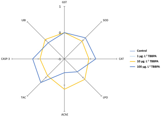 The radar plot of IBR index is presented in Figure 2. Differences are only observed when comparing animals tested to the highest concentration (100 µg·L−1) with all other tested animals. Thus, a decrease in MDA concentrations and in AChE activities can be observed, along with a slight decrease in UBI concentrations. GST showed no differences among all tested animals. For SOD, CAT, CASP-3, and TAC, there was a slight increase, as shown by the IBR radar plot.