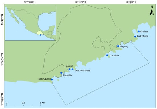 The Huatulco reef area is located on the western margin of the Gulf of Tehuantepec in the southern Mexican Pacific (Figure 1). The Eastern Pacific warm pool (SST > 28 °C) influences these coastal waters; this oceanographic feature is centered off Guatemala and the southwestern coast of Mexico and is characterized by high temperatures, small annual thermal oscillations (<2 °C), an average surface salinity of 34, and the presence of a shallow (20–40 m) and relatively stable thermocline []. Seasonally (November through March), the area is under the influence of intense wind bursts called Tehuanos, which produce substantial changes in the structure of the water column and complex coastal circulation []. ENSO events, which have a frequency of 4–5 years between phases, are the predominant cause of interannual oceanographic fluctuations within the southern Mexican Pacific [].