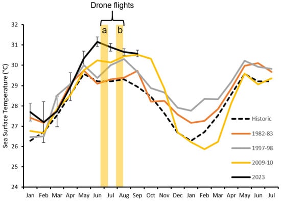 Historical monthly average sea surface temperature (SST) records (1870–2022) and satellite-derived (Aqua/MODIS, level 3 processing, resolution of 4 × 4 km, http://oceancolor.gsfc.nasa.gov accessed on 20 September 2023) SST (January–September 2023) from Huatulco. Color lines refer to previous ENSO events in the Huatulco area. Drone flights: (a) late June–early July 2023; (b) early August 2023. For exact dates, see Table 1.
