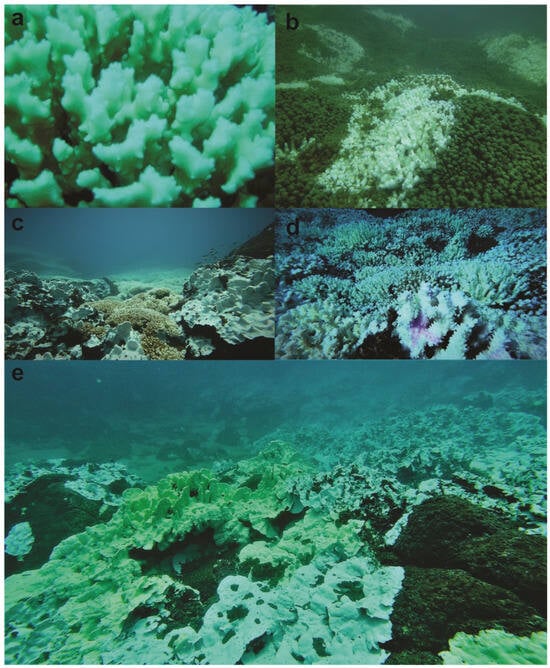 Coral bleaching in Huatulco, southern Mexican Pacific: (a) detail, bleached Pocillopora verrucosa, San Agustín reef, 5 m depth, 20 August 2023; (b) bleached and recently dead corals, Cacaluta island, 5 m depth, 21 August 2023; (c) bleached reef landscape, Cacaluta island, 5 m depth, 21 August 2023; (d) bleached and fluorescent Pocillopora spp. reef landscape, Cacaluta island, 5 m depth, 21 August 2023; (e) bleached and fluorescent Pavona gigantea landscape, Violín reef, 9 m depth, 23 August 2023. Photo credits: Andrés López Pérez (a,b); Virgilio Antonio Pérez, Buceo Huatulco (c–e).