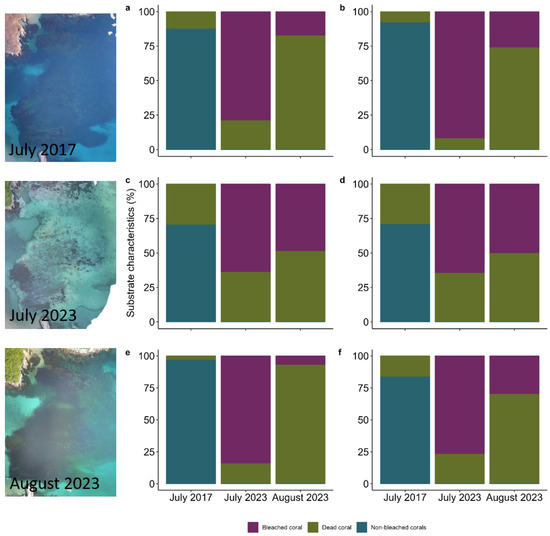 Drone-derived substrate characteristics (%) during non-bleaching (July 2017, left panel above) and 2023 El Niño bleaching (early July, left panel middle; early–middle August 2023, left panel below) in Huatulco, southern Mexican Pacific: (a) San Agustín; (b) Riscalillo; (c) Cacaluta island; (d) Maguey; (e) La Entrega; (f) Huatulco.