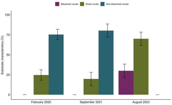 Data analysis revealed significant changes in substrate characteristics over time in the study area. Bleaching was not observed during the non-bleaching periods (February 2020 and September 2021) but increased rapidly and significantly in the summer of 2023 (29.9%, Mann–Whitney U-test = −7.28, n = 132, p = 0.0001). Additionally, dead coral coverage remained relatively invariable during non-bleaching periods (19.7–24.7%) but peaked sharply during 2023 El Niño bleaching (70 ± 23.5%, Mann–Whitney U-test = −6.81, n = 132, p = 0.0001). Non-bleached live coral coverage remained relatively stable during non-bleaching periods (75.3–80.2%) but dropped to zero by July 2023 (Mann–Whitney U-test = 8.58, n = 132, p = 0.0001). In summary, the live coral coverage in the Huatulco area was approximately 75–80% during non-bleaching periods, with dead coral coverage ranging within 20–25% with no signs of bleaching. However, by July 2023, all corals at all sites had bleached entirely, and by August, 50–93% of the total coral cover had died (Figure 4 and Figure 5).