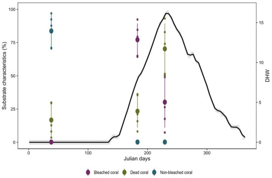 Changes in substrate characteristics (%) and degree heating weeks (DHW, black line) daily data for 2023 in the southern Mexican Pacific. DHW and substrate characteristics (average ± 95% confidence interval).