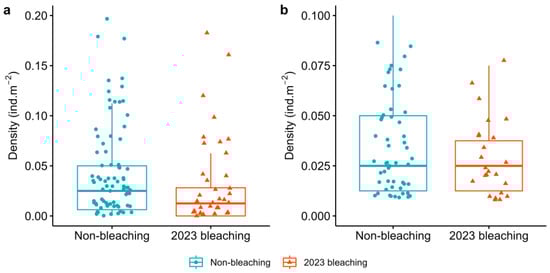 Sea urchin density during non-bleaching (2020–2021) and 2023 El Niño bleaching time frames in Huatulco, southern Mexican Pacific: (a) Eucidaris thouarsii; and (b) Diadema mexicanum.