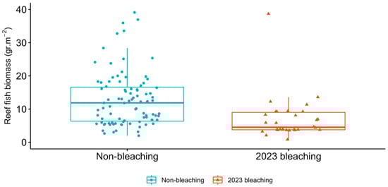 Corals experienced no heat stress in the Huatulco area from 1 January to 16 May 2023 (Figure 6). Reef surveys conducted during February 2023 resulted in non-bleached corals; however, from 17 May 2023 (day 137), the coral bleaching heat stress increased rapidly. By 21 June 2023 (day 172), DHW showed values over 5 in concordance, with a video being posted on social networks showing the coral bleaching. From 2 to 6 July 2023 (days 183–187), reef surveys presented massive coral bleaching and modest coral mortality associated with heat stress. Between 17 and 21 August 2023 (days 229–233), DHW reached values around 15–16, and reef surveys revealed massive coral mortality (Figure 6). Echinoderm abundance and fish biomass also experienced significant declines. Declines in abundance were observed in both of the sea urchins Eucidaris thouarsii (Student-t = 2.24, n = 147, p = 0.0001; Figure 7a) and Diadema mexicanum (Student-t = 2.01, n = 147, p = 0.0001; Figure 7b) in August 2023, when compared to the previous non-bleaching sampling periods. There was also a significant decrease in fish biomass during the 2023 bleaching event (Mann–Whitney U-test = −6.9, n = 147, p = 0.0005; Figure 8) in the Huatulco area reefs.