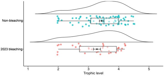 During La Niña and ENSO-neutral periods, we recorded 80 fish species, whereas this richness decreased significantly to 36 species during the 2023 El Niño. The majority of the decreased biomass belonged to corallivorous species (non-bleaching biomass: Pseudobalistes naufragium, 79.25 g·m−2; Cantherhines dumerilii, 67.42 g·m−2, Arothron hispidus, 64.60 g·m−2) and carnivorous species (non-bleaching biomass: e.g., Diodon holocanthus, 139.22 g·m−2; Haemulon scudderii, 49.08 g·m−2; Caranx caninus, 41.50 g·m−2). The omnivorous species (19 species) with a trophic range of 2.8–3.7 and super-carnivorous species (20 species) with a trophic level greater than 3.8 exhibited the most significant declines. Prior to the El Niño event, the average trophic level was 3.43 while, during El Niño, it dropped slightly (3.28), indicating a shift toward fish with omnivorous feeding habits in the systems (Figure 9).