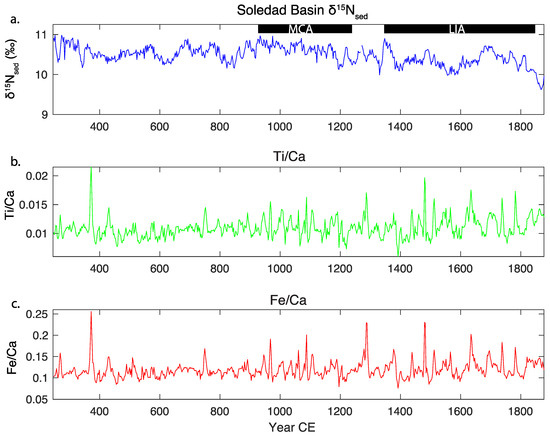 The Soledad Basin δ15Nsed record from core SOLE-GC1 (a) and XRF records of Ti/Ca (b) and Fe/Ca (c) from the SOLE-GC1 core. The Medieval Climate Anomaly (MCA; 950–1250 CE) and the Little Ice Age (LIA; 1350–1850 CE) are labeled. The Soledad Basin δ15Nsed data from (a) is available in Supplementary Materials (Table S1) and the Soledad Basin Ti/Ca and Fe/Ca data from (b,c) are available in Supplementary Materials (Table S2).