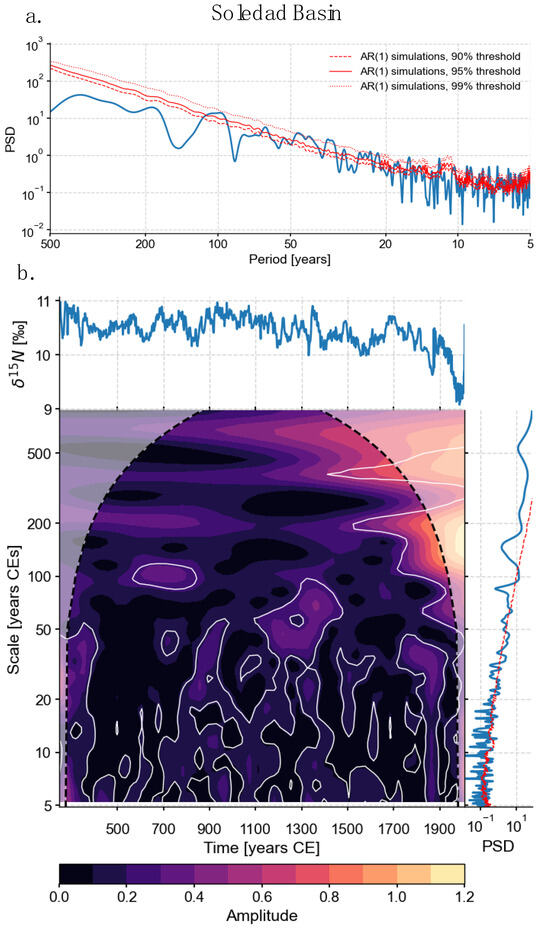 (a) Spectral analysis of the Soledad Basin δ15Nsed data shows multidecadal peaks in the 20–50-year band and 100-year band above 95% confidence. Confidence intervals are indicated on the figure with the red dashed line representing 90% confidence, the red solid line representing 95% confidence, and the red dotted line representing 99% confidence. (b) The δ15Nsed record is presented at the top of this figure, and the wavelet analysis below. The wavelet analysis indicates where the strongest periodicities occur in the record. They are found at 500–900 CE in the 100-year band, 1200–1500 CE in the 20–50-year bands, and 1750–1900 CE in the 20–50-year bands. The black dotted lines on the wavelet analysis represent the cone of influence. The solid white lines outline areas of 95% confidence. The spectral analysis (presented in a) with the 95% confidence interval (red line) is shown to the right of the wavelet analysis to visualize the connection between the spectral periodicities and wavelet time intervals.
