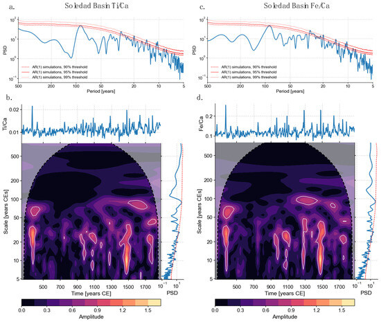 (a,c) Spectral analysis of the Ti/Ca (a) and Fe/Ca (c) XRF elemental data from the SOL-GC1 core. Confidence intervals are indicated in the figures. (b,d) The elemental ratios are presented at the top of the figure and the wavelet analysis below. The black dotted lines on the wavelet analysis represent the cone of influence. The solid white lines outline areas of 95% confidence. The spectral analysis (presented in (a,c)) with the 95% confidence interval (red line) is shown to the right of the wavelet analysis to visualize the connection between the spectral periodicities and wavelet time intervals. In the Ti/Ca and Fe/Ca elemental data, a 10–40-year band and a 100-year band are present, which are strongest from 200 to 500 CE, 900 to 1100 CE, and 1250 to 1500 CE.