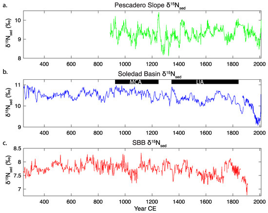 A comparison of the δ15Nsed records between all three sites: Pescadero Slope (a), Soledad Basin (b), and Santa Barbara Basin (SBB) (c), The Medieval Climate Anomaly (MCA; 950–1250 CE) and the Little Ice Age (LIA; 1350–1850 CE) are labeled on the Soledad Basin δ15Nsed record (b).