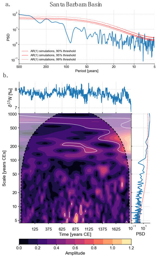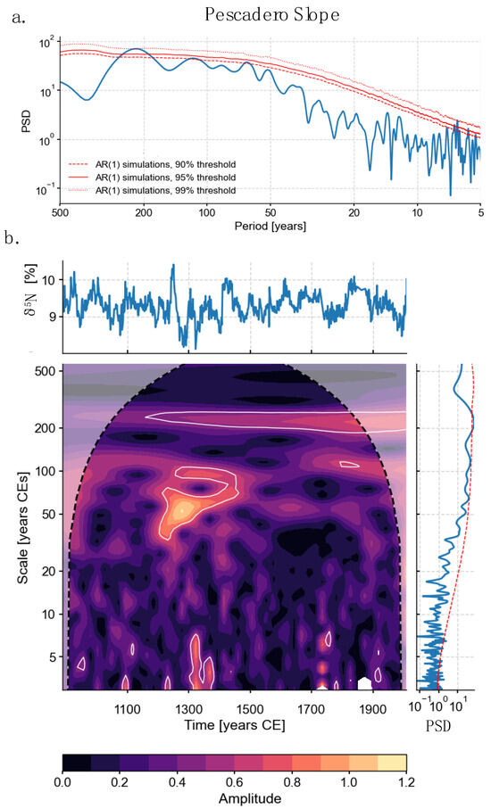 Spectral and wavelet analysis of the Soledad Basin δ15Nsed record reveals multidecadal periodicities in 20–50-year bands (Figure 3a) with strong periodicities at the end of the MCA and beginning of the LIA between 1200 and 1500 CE (Figure 3b). In the Pescadero Slope δ15Nsed record, significant periodicities were found between the 50−100-year band (about 90–95% confidence) and 200-year band (99% confidence). These results are in line with previously published periodicities in the Pescadero Slope δ15Nsed record [12]. The strongest periodic signals recorded in the 50–100-year bands occurred in the LIA (between 1250 and 1500 CE) and the 200-year band (around 1350–1950 CE). The multidecadal periodicities are interpreted as representing the PDO and/or ENSO and are similar to Soledad Basin periodicities (Figure 6). The SBB δ15Nsed record shows limited multidecadal periodicities with a significant peak near the 10-year band and in the 200-year band with the strongest signal between 850 and 1100 CE (Figure 7).