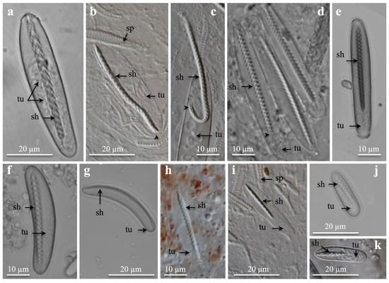 Light microscopies of undischarged microbasic b-mastigophores showing inverted shaft and tubule. Note upside-down v-shaped spine-patterns on shaft. (a) Large, broad oval to drop-shaped b-mastigophores from cnidorages. (b–d) Large, broad, parallel capsule b-mastigophores from marginal tentacles. Arrowhead points at last spines at shaft end. (e) From labial tentacle and (f,g) from mesenterial filament and marginal tentacle, respectively. (e,f) Medium to large b-mastigophores and (g) medium bow-shaped b-mastigophores. (h) From labial tentacle, and (i) from marginal tentacles. (h,i) Medium, broad b-mastogophores. (j) Small, oval broad b-mastigophore from mesenterial filament, and (k) small, broad b-mastigophore from marginal tentacles. (a) Botruanthus benedeni. (b,c,h,i,k) Pachycerianthus torreyi. (d) P. multiplicatus. (e) P. dorhni. (f,g,j) Cerianthus sp. 1. Abbreviations: sh, shaft; sp, spirocyst; tu, tubule. Arrowhead points at last spines at shaft-end.
