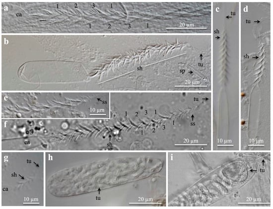 Light microscopies pictures of (a–g) discharged microbasic b-mastigophores and (h,i) isorhizas. (a–g) Capsule, shaft, and tubule, (a–e) from tentacles, (f) from craspedonemes, and (h,i) from column membrane. (a) Shaft showing helical spine rows (1, 2, 3, 1). (b) Medium to large broad b-mastigophore. (c,d) Medium to large narrow b-mastigophore. (e,f) Shafts of large b-mastigophores showing helical spine rows. Note small spines at shaft end. (g) Small, broad b-mastigophore. (h,i) Large, broad isorhizas, (h) undischarged, and (i) partly discharged. Note tubule pattern. (a–e,g,h) Pachycerianthus torreyi. (f,i) P. multiplicatus. Abbreviations: ca, capsule; sh, shaft; sp, spirocyst; ss, small spines; tu, tubule.