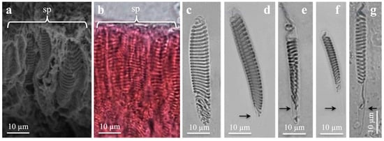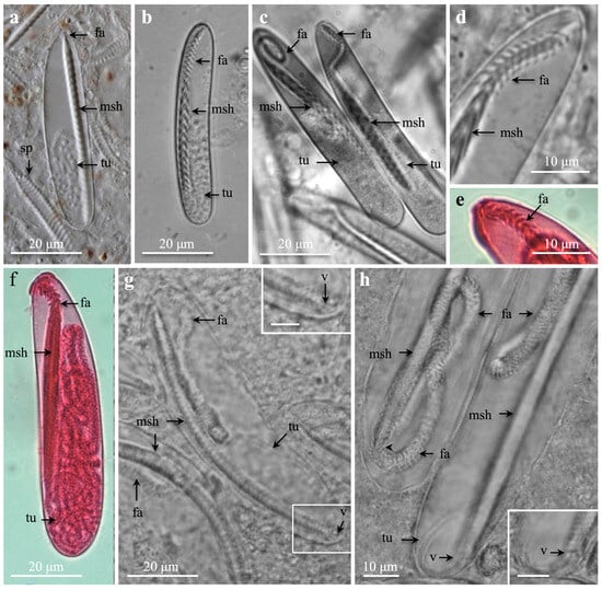 The discharged shafts showed three helical rows of long spines (Figure 2a–g). The broadness of the capsules varied, which was most evident in empty, flattened capsules, when the squash preparation had dried (Figure 2b–d). In the fixed material, spines could clog together (Figure 2a–e), but in fresh material, the spine pattern was clearer (Figure 2f). The large, prominent spines gradually decreased in size towards the shaft end (Figure 2e,f). The decreasing number of spine rows is shown from large (Figure 2a,f) and medium (Figure 2c,d) to small b-mastigophores (Figure 2g). Immature capsules, late in development, were often bow-formed and slightly broader than mature ones.