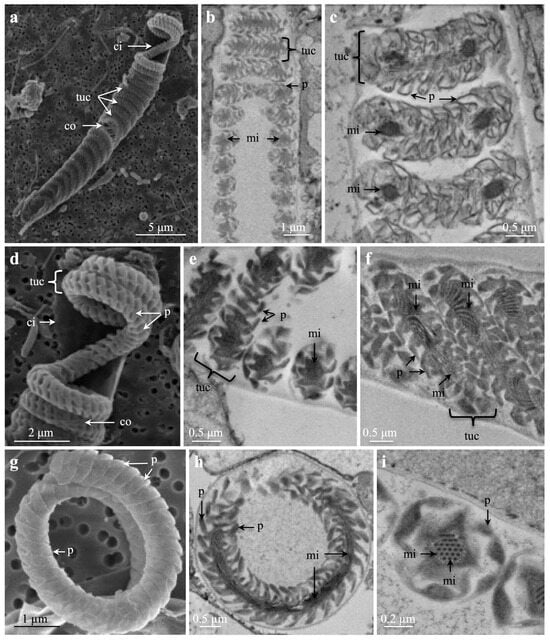 Scanning electron microscopies (a,d,g) and transmission electron microscopies (b,c,e,f,h,i) of spirocysts from marginal tentacles of Cerianthus sp. 1. Note increasing magnifications (a–i). (a) Partly transparent capsule showing inner and outer capsule wall and regular tubule coils. (b,c) Parts of tubule coils. Note pleats on tubule wall and microfibrillae/mini-tubules inside tubule. (d) Enlarged upper capsule showing some tubule coils. Note inner and outer capsule wall and pleats on tubule wall. (e,f) Note regular pleats of tubule wall and microfibrillae in the centre/tubule core. (g) Part of a coiled tubule showing pleats on tubule wall. (h,i) Note pleats and microfibrillae, (h) cross-section of tubule coil, (i) cross-section of tubule. Abbreviations: ci, inner capsule wall; co, outer capsule wall; mi, microfibrillae/mini-tubule; p, pleat on tubule wall; tuc, tubule coil.