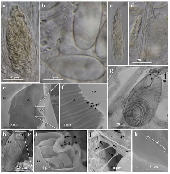 Light microscopies (a–d,g) and scanning electron microscopies (e,f,h–k) of ptychocysts from tube membranes. (a) Very large, broad, drop-shaped ptychocysts, (b) large, broad, drop-shaped ptychocysts, (c) medium, elongate ptychocysts (magnification as in (a,b,d)), (d) small, elongate and broad, medium ptychocysts. (b,d) Note striations on capsule wall. (e,f) Inner capsule wall with striations, note outer capsule wall. (g) Large, broad, drop-shaped ptychocyst. Note absence of striations on capsule wall, and inverted tubule (arrows) inside everting tubule. (h–k) Inside tube. (h,i) Broken capsule (h) and enlargement (i) showing outer capsule wall, inverted, pleated tubule with longitudinal folds in circumference. (j,k) Parallel-oriented tubules forming the tube membrane, (j) note arrows pointing to tubules running in different directions. (a,e,f,h–k) Pachycerianthus dorhni. (b–d) P. torreyi. (g) Botrucnidifer sp. 1. Abbreviations: ci, inner capsule wall; co, outer capsule wall; lf, longitudinal tubule fold; tu, tubule; st, striation on capsule wall.