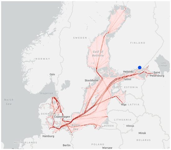Cargo ship traffic intensity in the Baltic Sea in 2021 [17]. Case study port HaminaKotka is marked with blue spot.