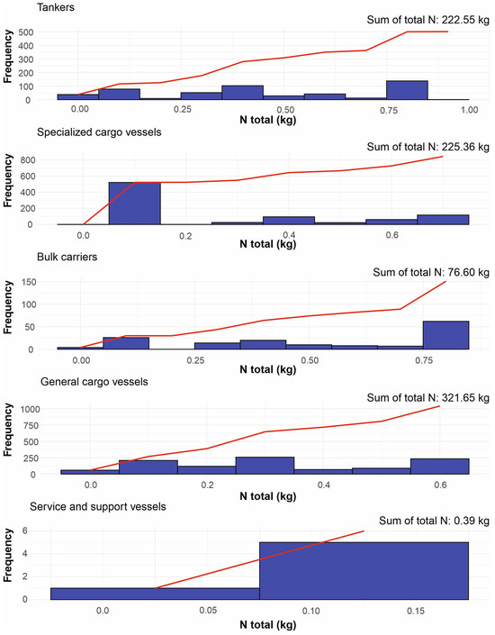 Estimated frequency distribution and total annual nitrogen discharges by ship type at the studied port. The red line represents the cumulative load of nutrient discharges.