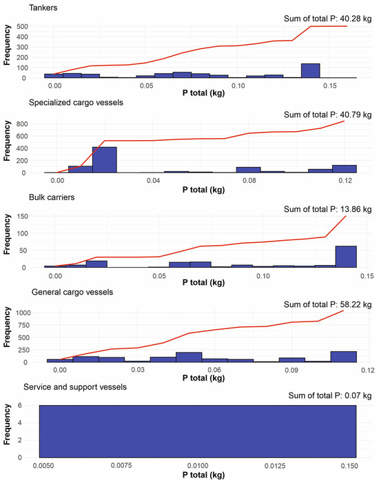 Estimated frequency distribution and total annual phosphorus discharges by ship type at the studied port. The red line represents the cumulative load of nutrient discharges.