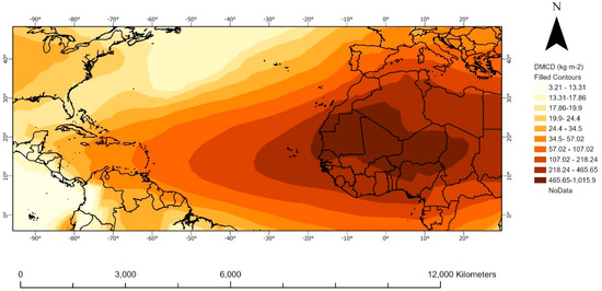 Monthly Sargassum concentrations (SCT) in tons for a section of the Eastern Caribbean (−80.5, 10, −60, 23.5) were obtained from the Optical Oceanography Lab at the University of South Florida [27]. The monthly average Sargassum in tons was extracted for June, July, and August (JJA), which have been documented to be the period with higher concentrations of the algae [1,12]. The temporal resolution of the Sargassum data is from 2010 through 2022. Mann–Kendall (MK) tests for trends were performed on the DMCD and SCT to determine if the dust and Sargassum concentrations during the JJA period or individual months were increasing over time. The MK test is a widely used statistical test in the atmospheric sciences that allows for robust trend detection, and several studies have implemented the method to analyze trends in dust aerosols [28,29,30].