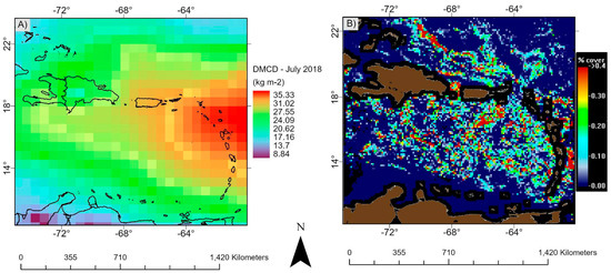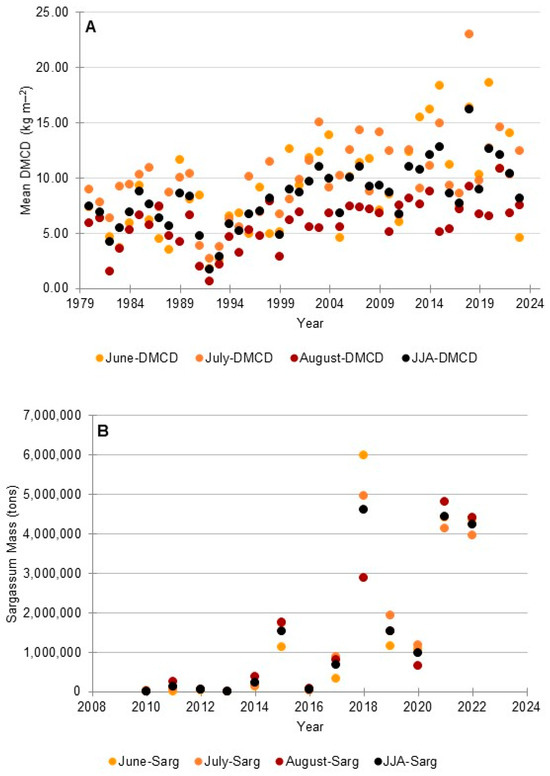 Average dust mass column density (DMCD) data—which refers to the total mass per unit area of a specific substance, such as aerosols or gasses, extending vertically from the Earth’s surface to the top of the atmosphere—were obtained from MERRA-2 (Modern-Era Retrospective Analysis for Research and Applications, version 2), a state-of-the-art atmospheric reanalysis model developed by NASA. This variable is calculated by integrating the atmospheric concentration of the aerosols over the entire vertical column above a given point on the Earth’s surface. The integration involves accounting for factors such as the vertical distribution of the dust and aerosols, the density of the air, and the altitude variations within the column. The monthly average MCD data were extracted for the Eastern Caribbean region of the tropical North Atlantic (−80.5, 10, −60, 23.5) for the entire period 1980–2022 (Figure 2A). The analysis was limited to that section of the study area to compare DMCD concentrations with Sargassum coverage areas (Figure 2B). The DMCD data have been used by previous researchers examining trends and patterns in Saharan dust concentrations [24,25,26].