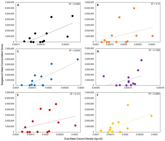 The results of the lagged regression models also show positive correlations between DMCD and SCT (Figure 4E,D). When the lagged regression was done using DMCD for June and SCT for July, we found a positive yet weak correlation between Saharan dust and Sargassum (Figure 4E). However, when the analysis was performed using DMCD for July and SCT for August, the results yielded a stronger positive correlation between the two factors (Figure 4D). These findings suggest that higher dust concentrations in June do not necessarily materialize into higher Sargassum quantities in July. Yet, greater amounts of dust in July show a stronger statistical relationship with elevated Sargassum concentrations. These results are similar to those found in previous studies [12,14], showing that higher Saharan dust concentrations likely enhanced some of the recent Sargassum outbreaks in the region.