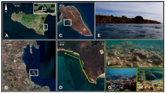 Study area (A) Sicily and the location of the gulfs of Augusta and Priolo–Melilli; these latter are indicated by the white box in the lower right corner (the white box in the top right corner shows the position of Sicily (Italy) in the Mediterranean Sea); (B) Gulfs of Augusta and Priolo–Melilli, the Magnisi peninsula is indicated by the white box; (C) the Magnisi peninsula, the study area is indicated by the white box; (D) in the examined coastal stretch, the location of the two different bottom types is indicated by the different colorations. The arrow indicates the start point and the followed direction of the snorkeling path; (E) a general view of the examined coastal tract; (F,G) the appearance of the bottom of the first area, edge colored in green; (H) aspect of the bottom of the second area, edge colored in yellow.