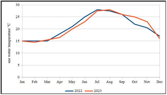 The following graphs were created from the collected data: a bar chart on the number of species for each taxonomic group, a line chart on the variation in the number of nudibranch species per month, a bar chart on the variation in the number of nudibranch species per season, and a bar chart on the total abundance for each species. In this case, the seasons were considered as follows: winter (January + February + March), spring (April + May + June), summer (July + August + September), and autumn (October + November + December). Monthly water temperature values can be seen in Figure 2.