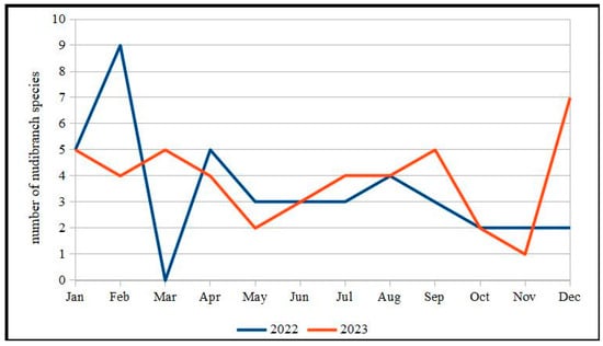 In 2022, after a rapid rise in species number between January (5 species) and February (9), there was a total decline in nudibranch species number in March (0). After this month, the nudibranch species number rose in April (5), then it fell slightly in the subsequent months until the stable lowering of October, November, and December (2) (Figure 3). In 2023, the nudibranch species number remained more or less constant from January (5) to April (4) and then decreased in May (2). After this month, there was an increase in the species number until September (5). Later, October (2) and November (1) recorded the lowest nudibranch species number of 2023. After this decline, there was a sharp increase in December (7).