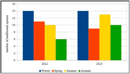 Considering the variation in nudibranch species number per season (Figure 4), it can be seen that in 2022 there was an almost constant decline in species number across seasons [Winter (14 species), Spring (11), Summer (10), and Autumn (6)]. In 2023, on the other hand, the trend was more constant between seasons [Winter (14), Spring (9), Summer (13) and Autumn (10).