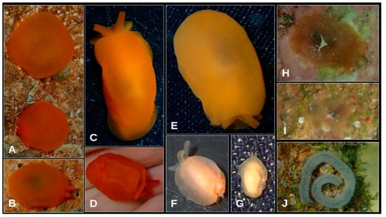 Berthella stellata (Risso, 1826) (about 10–12 mm in length) (Figure 5H–J).