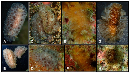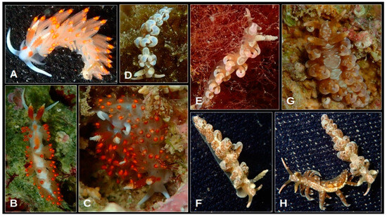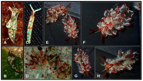 Spurilla neapolitana (Delle Chiaje, 1841) (about 15–20 mm in length) (Figure 6D–H).