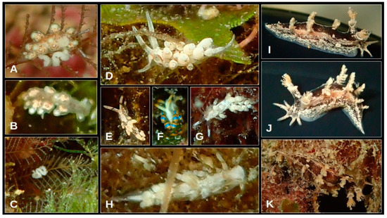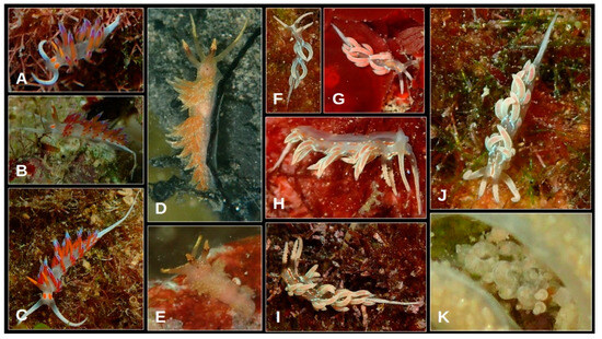 Cratena peregrina (A–C) three specimens. Facelina annulicornis (D) a specimen in the right dorsolateral; (E) the wounded individual. Facelina rubrovittata (F,G) two small specimens. (H) left view of a specimen; (I) left dorsolateral view; (J) dorsal view. Favorinus branchialis (K) a specimen feeding on the egg masses of Dendrodoris limbata.