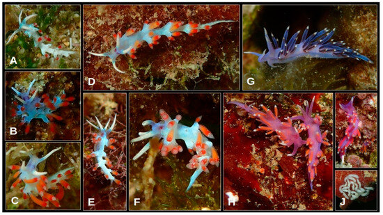 Facelina rubrovittata (A. Costa, 1866) (8–15 mm in length) (Figure 7F–J).