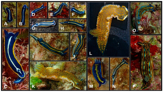- Gosliner, T.M.; Valdés, Á.; Behrens, D.W. Nudibranch & Sea Slug Identification–Indo-Pacific, 2nd ed.; New World Publications, Inc.: Jacksonville, FL, USA, 2018; pp. 1–451. [Google Scholar]