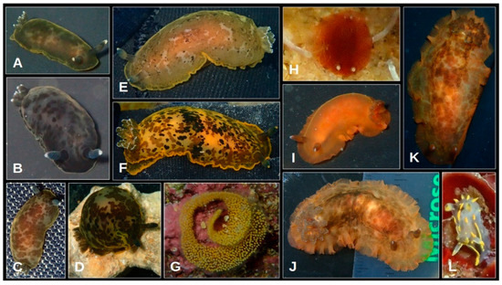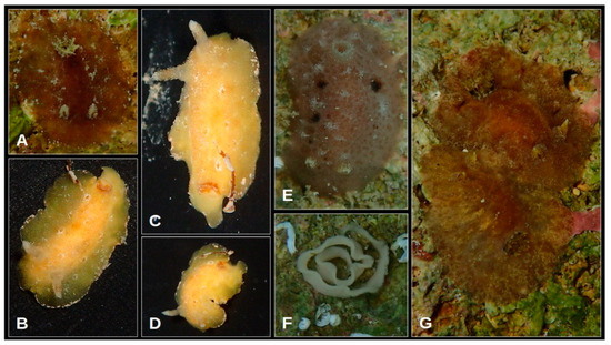 - Valdés, Á.; Ortea, J.; Ávila, C.; Ballesteros, M. Review of the genus Dendrodoris Ehrenberg, 1831 (Gastropoda: Nudibranchia) in the Atlantic Ocean. J. Molluscan Stud. 1996, 62, 1–31. [Google Scholar] [CrossRef]