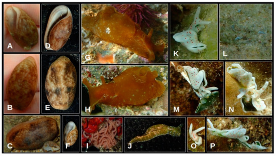 Through subsequent examination of the photographs, it was possible to make the specific identification of each sea slug and to note the different substrates on which the specimens were found. The sources consulted for the identification of the sea slugs were Prkić et al. [19], Rudman [20], Trainito and Doneddu [21], Valdés et al. [25], Galià-Camps et al. [26], and OPK Opistobranquis [24]. The identification of zoo- and phytobenthic components was performed following Trainito and Baldacconi [27] and Rodríguez-Prieto et al. [28], respectively. The used nomenclature is that reported on WoRMS [29].
